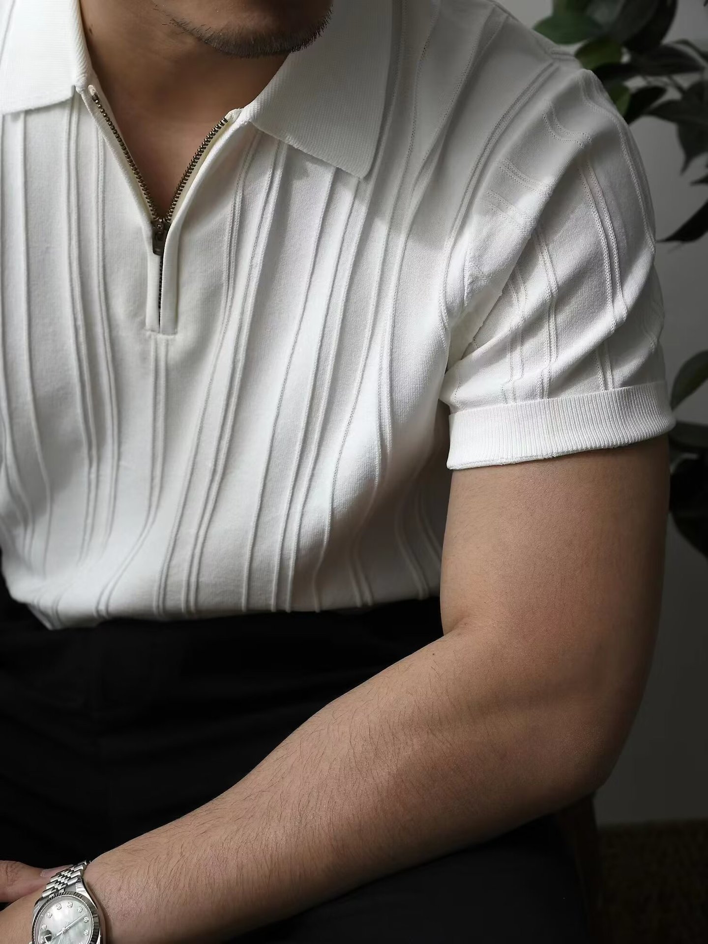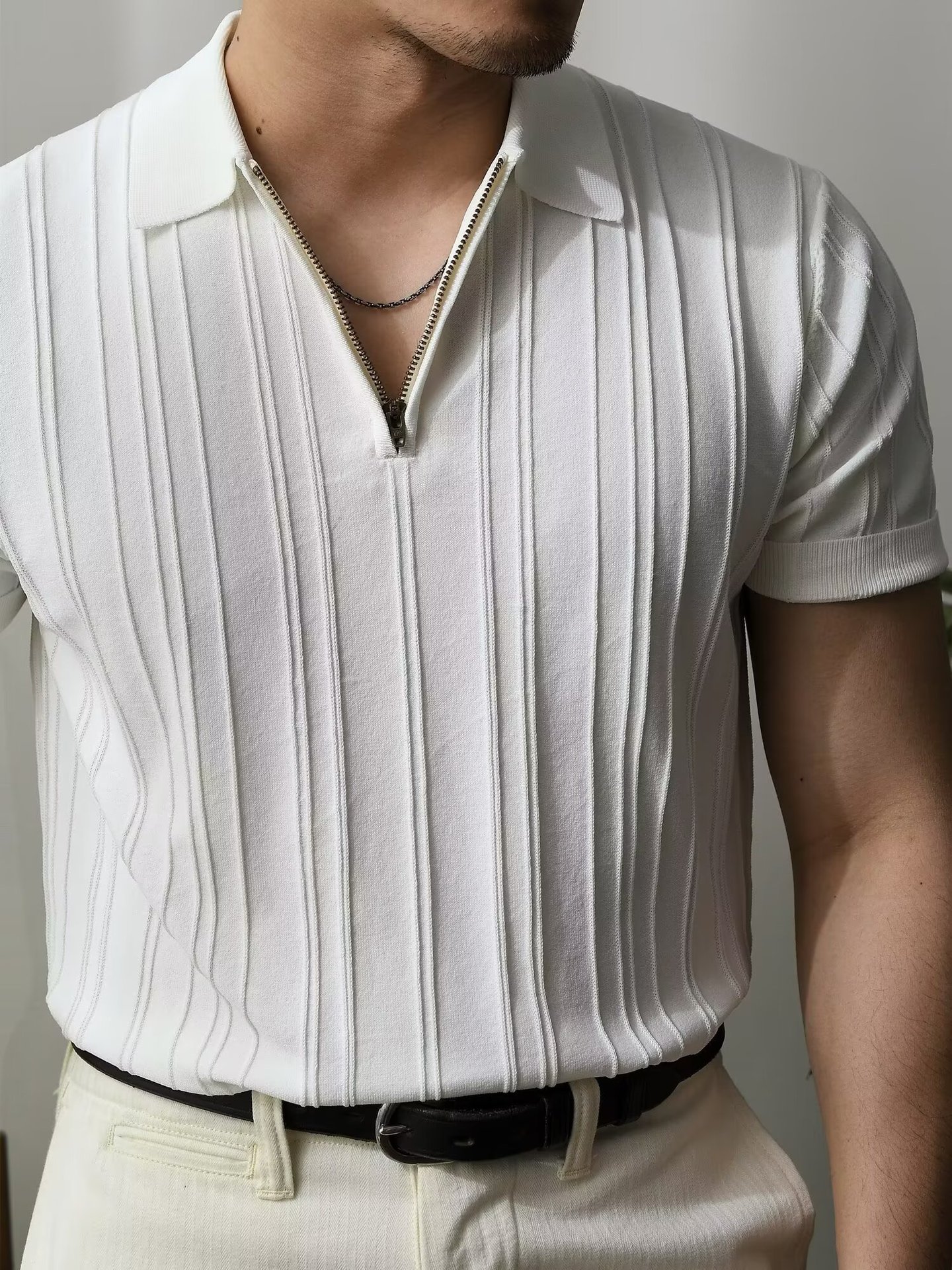 Upgrade your warm-weather wardrobe with this men’s striped zipper polo shirt, designed with a modern style and comfortable fit. The shirt features a sleek front zipper detail combined with a classic lapel collar, creating a contemporary look that works well for both casual and smart-casual outfits.