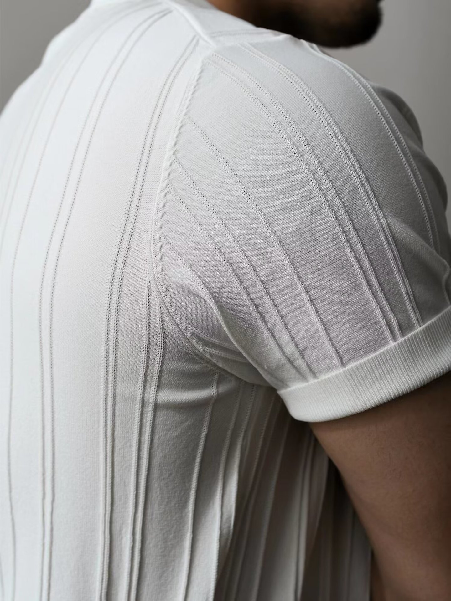 Made from soft knitted polyester fabric, the shirt offers breathability and lightweight comfort, making it ideal for warm summer days. The vertical stripe pattern adds a stylish touch while creating a visually slimming effect.